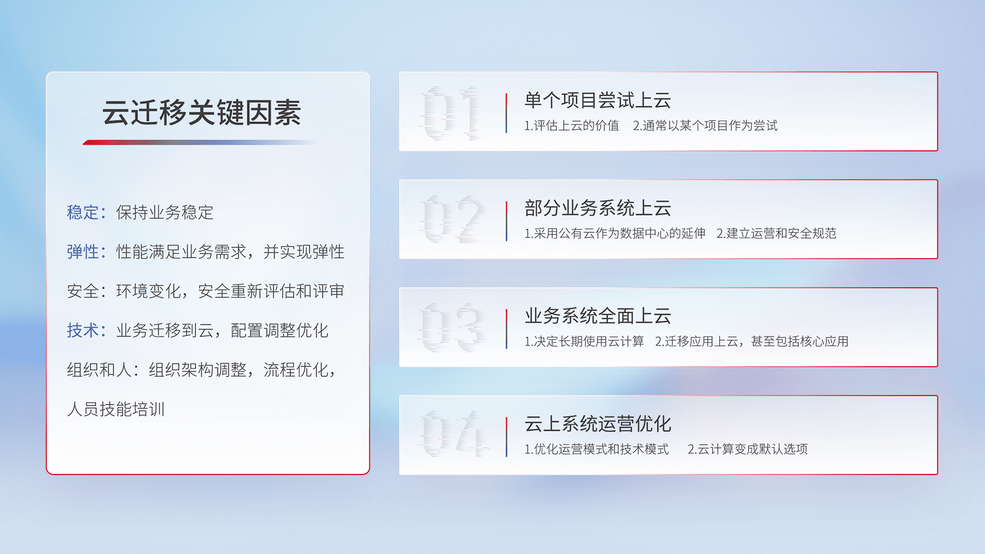 结合实际业务,,,从规划设计、、、云平台选型、、云原生改造、、、数据迁移、、集成交付,,,迁移全过程为客户识别最佳上云路径,,,,做好风险识别管理,,,,设计网络架构、、、、身份权限、、安全审计合规、、操作审计、、、日志审计、、、、监控告警策略、、、多站点容灾设计等,,,,对云上基础设施进行整体规划,,提升IT治理水平,,,以满足弹性、、、、高可用、、、高性能的需求。。。。