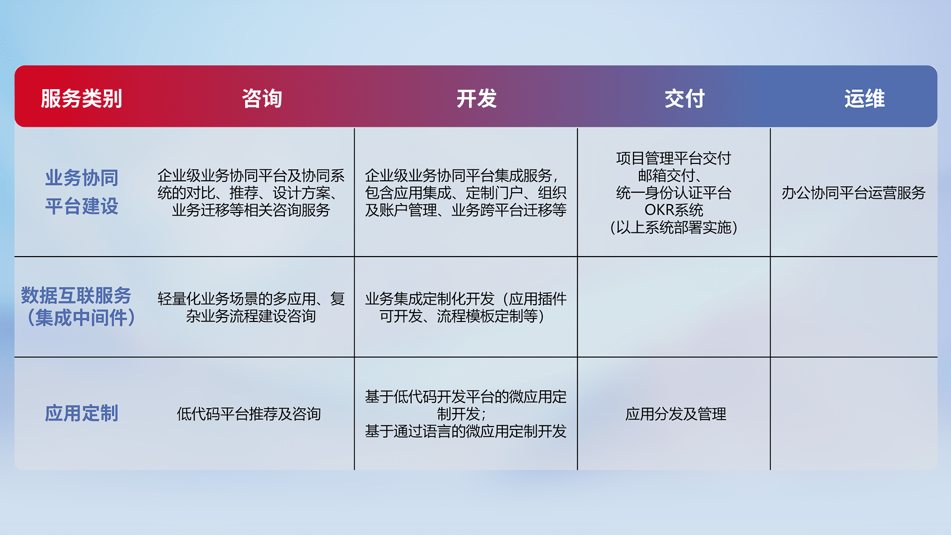 针对钉钉、、、、企微、、、、IDaas等平台级产品提供产品的规划、、方案、、交付、、、定制化开发等服务,,,,实现如统一协同办公、、、、智能客户服务、、混合会议管理、、、智能数据查询、、等业务场景,,实现数字化转型。。。。